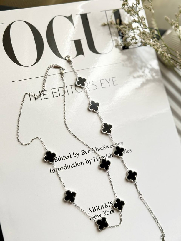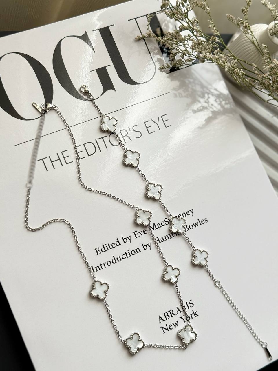 گردنبند و زنجیر استیل ونکلیف زنجیر نقره ای پنج گل گل سفید و گل مشکی