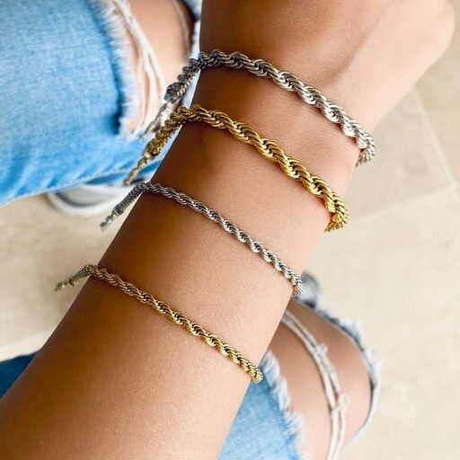 دستبند طنابی با جنس استیل و دارای آبکاری مناسب استفاده روزانه بسیار شیک و جذاب . رنگ ثابت و دارای زنجیر تنظیم میباشد