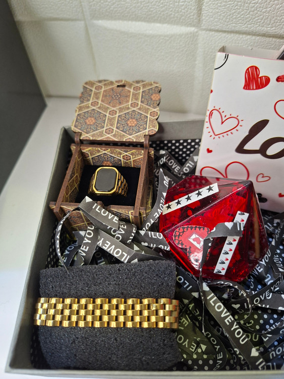 دستبند رولکس استیل رنگ ثابت قابل تنظیم و حک شده رولکس ، انگشتر استیل طلایی رنگ ثابت ، دوعدد شکلات ، عروسک و گل کاغذی ، باکس مقوایی ضخیم و باکس چوبی مربوط بع انگشتر