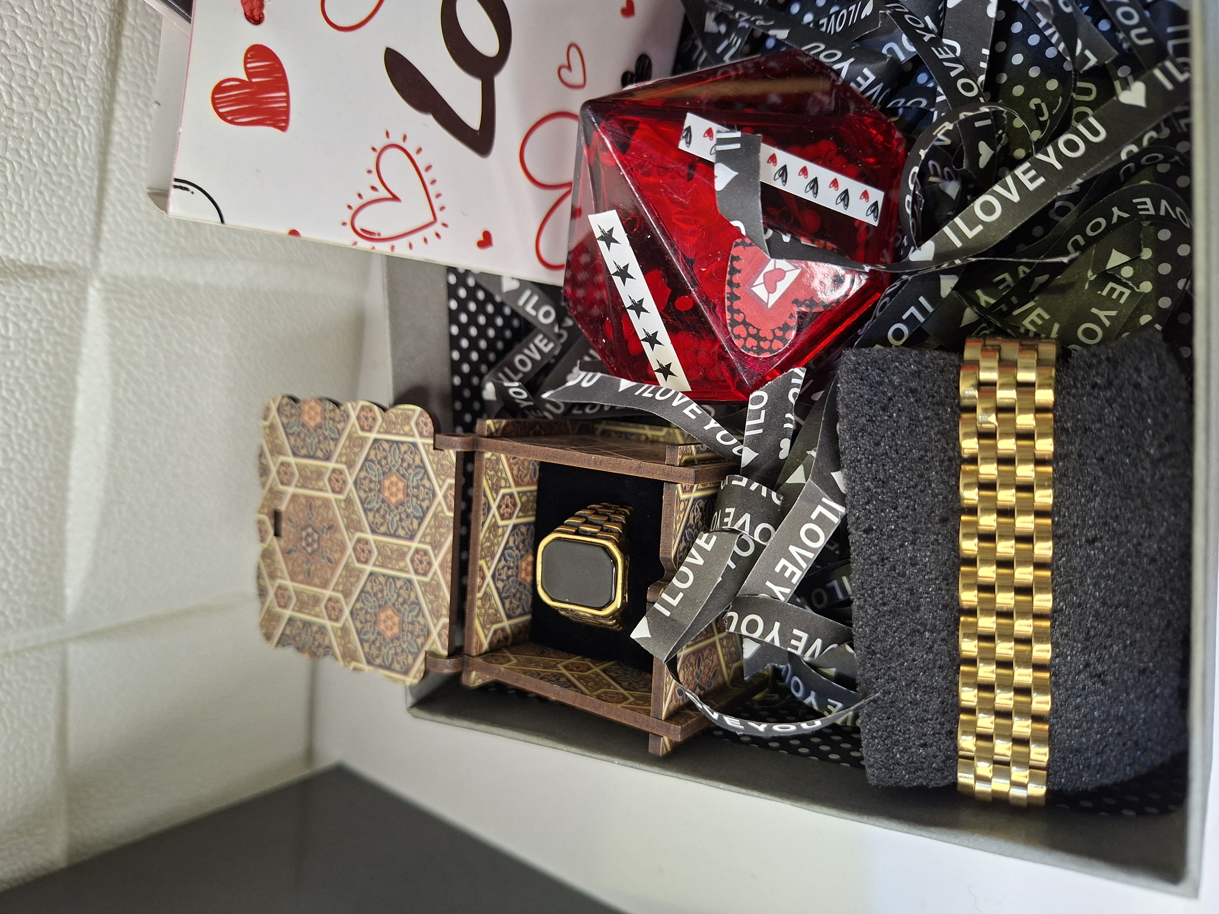 دستبند رولکس استیل رنگ ثابت قابل تنظیم و حک شده رولکس ، انگشتر استیل طلایی رنگ ثابت ، دوعدد شکلات ، عروسک و گل کاغذی ، باکس مقوایی ضخیم و باکس چوبی مربوط بع انگشتر