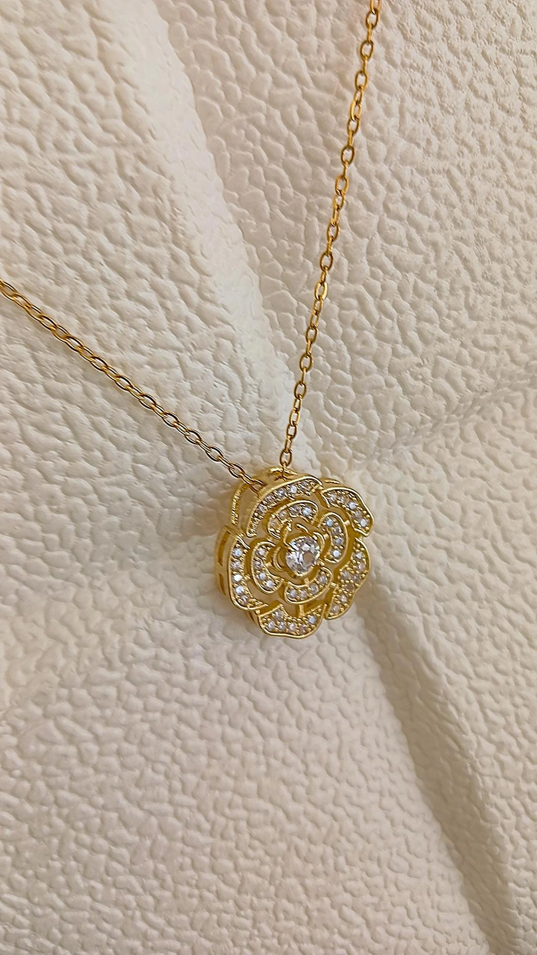 زنجیر و پلاک طرح گل ، پلاک برجسته میباشد و تمام نگین کریستالی کار شده